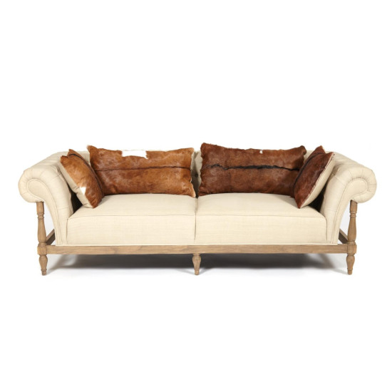 Диван на раме из красного дерева в стиле знаменитого американского бренда Restauration hardware, обит плотной хлопковой тканью с прошивкой капитоне, основание с резьбой ручной работы, 4 подушки из шкуры буйвола в комплекте. Объем: 1,93 куб.м.