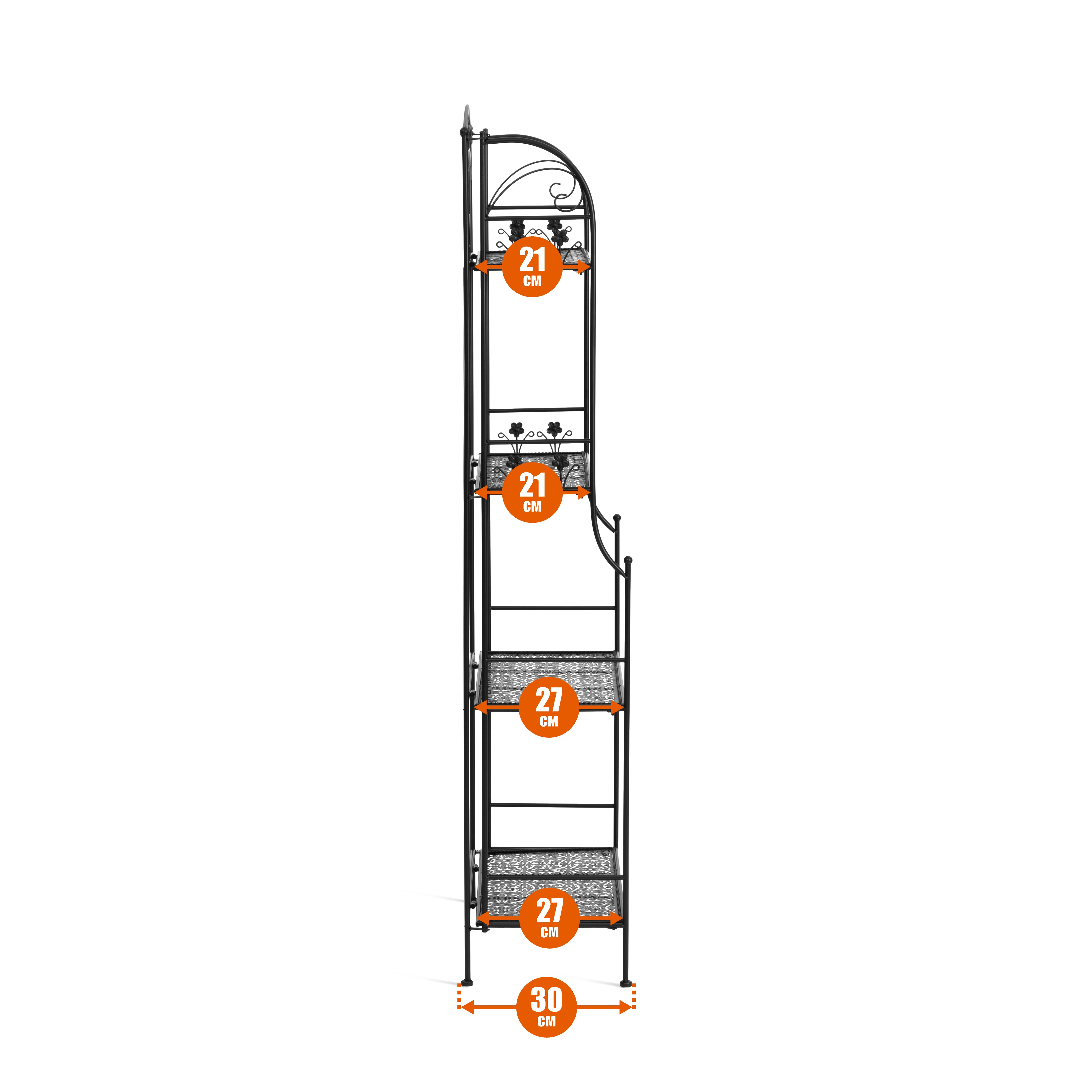 Каждая полка выдерживает нагрузку до 20 кг, а общая нагрузка на конструкцию составляет до 80 кг, что делает этажерку надежной и устойчивой даже при интенсивной эксплуатации. Расстояние между полками 38 см позволяет размещать предметы разной высоты, а ширина полок 55 см обеспечивает удобство использования. Разная глубина полок (от 21 до 27 см) делает хранение более удобным и функциональным.