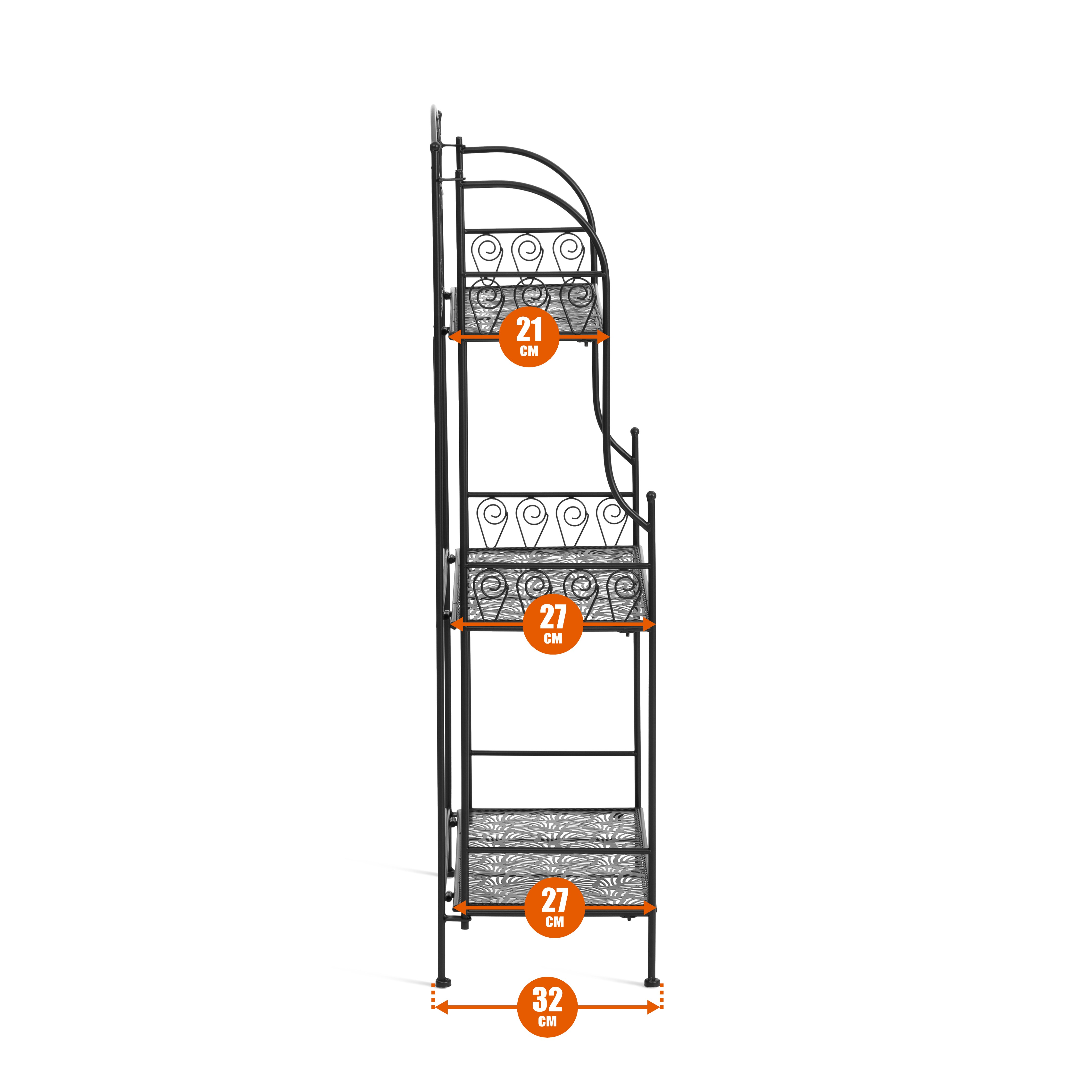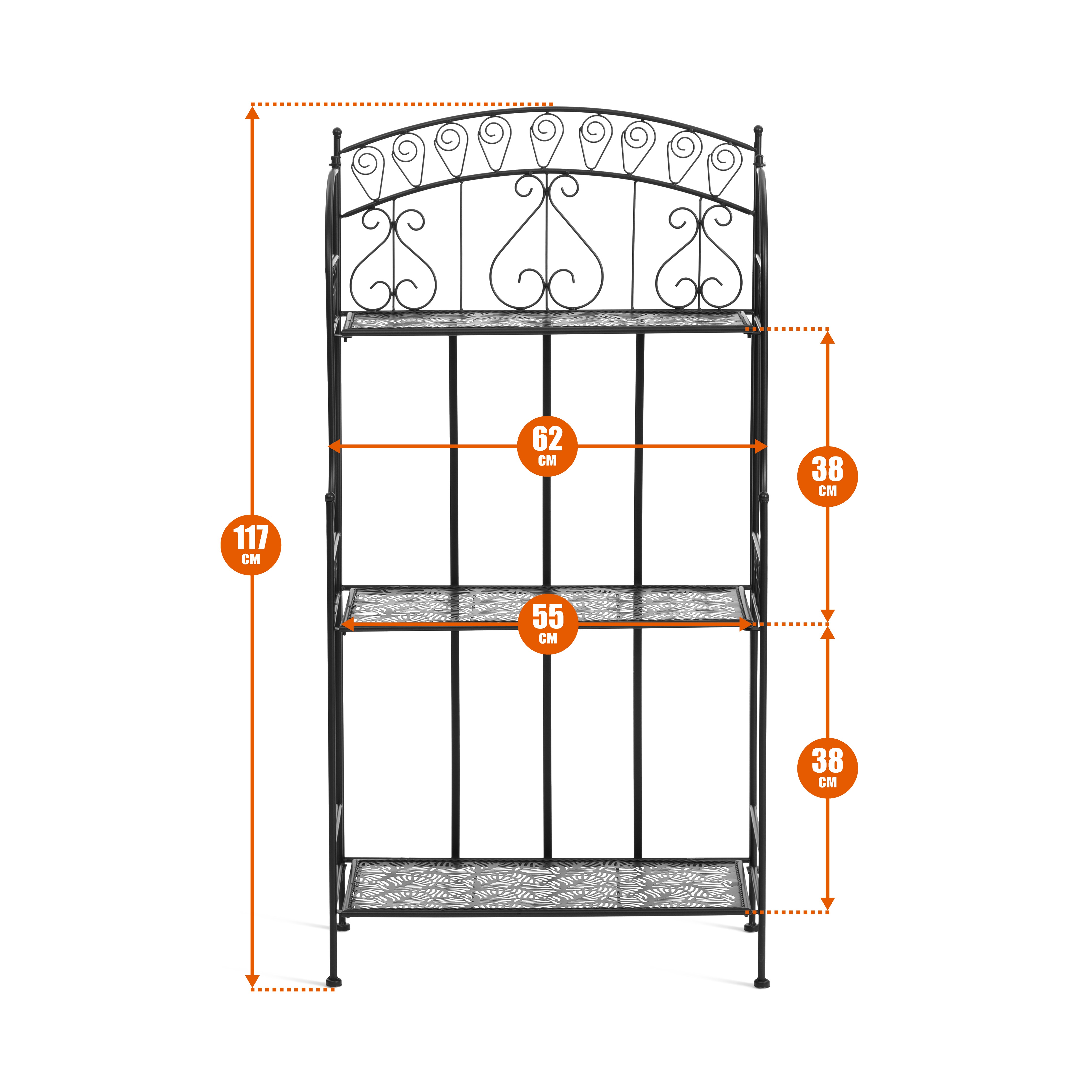 Напольная металлическая этажерка имеет прочную прямую конструкцию и оснащена 3 вместительными полками, что позволяет удобно разместить книги, посуду, декор, растения или бытовые принадлежности. Увеличенные размеры 62×32×117 см делают модель более вместительной по сравнению с компактными аналогами, сохраняя при этом удобную глубину для размещения в жилых пространствах.