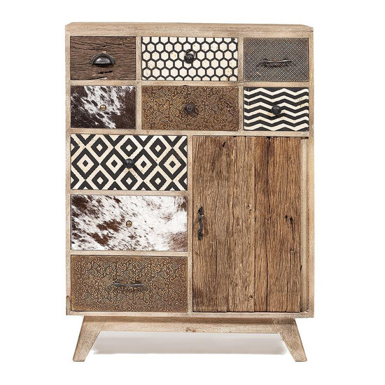 Оригинальный дизайн комода Secret de Maison LURA из коллекции LOFT ART позволит ему стать не только частью комнаты, но и задать тон вашему интерьеру. Каркас из натуральной древесины манго, деревянные ножки в стиле 60-х годов прошлого века, простота формы и нестандартное дизайнерское решение выгодно выделяют комод в интерьере. Качественная ручная работа, разномастные винтажные ручки, необычная отделка фасадов из шкуры буйвола и латуни с чеканкой смотрятся стильно и оригинально, привносят в дизайн живости и служат ярким акцентом изделия. Распашная дверца выполнена с использованием техники старения древесины, создающей эффект, будто дерево пролежало под солнцем и проливными дождями много лет. При всей простоте исполнения комод LURA является довольно вместительным и функциональным предметом обстановки, не требующим большого количества свободного места. Девять удобных выдвижных ящиков разного размера и закрытое отделение с дверцей позволяют хранить огромное количество предметов. Небольшие дефекты и потёртости смотрятся изысканно, оригинально и придают особенную красоту изделию. Натуральная древесина манго проста в уходе и будет долгие годы радовать вас своим первоначальным видом. Модель поставляется в собранном виде.