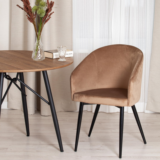 Удобное кресло LA FONTAIN из коллекции Modern хорошо смотрится в любой комнате: гостиной, спальне, детской, рабочем кабинете, столовой, кафе. В нем будет приятно расположиться после тяжелого рабочего дня. Обволакивающая форма спинки и мягкое сиденье обеспечат максимальный комфорт своему владельцу. Удачная комбинация металла черного цвета и обивки благородного коричневого цвета будет выигрышно смотреться в любом интерьере. Металлические ножки делают модель устойчивой, надежной, основательной. Приятная на ощупь и практичная в использовании обивка из вельвета коричневого цвета надолго сохранит свой первоначальный вид. Вельвет обладает повышенной износостойкостью, не протирается, не выцветает. Кресло LA FONTAIN станет любимым предметом для отдыха в вашем доме. Кресло подойдёт для гостиной, для кухни или для спальни. Кресло очень простое в сборке, инструкция по сборке прилагается.