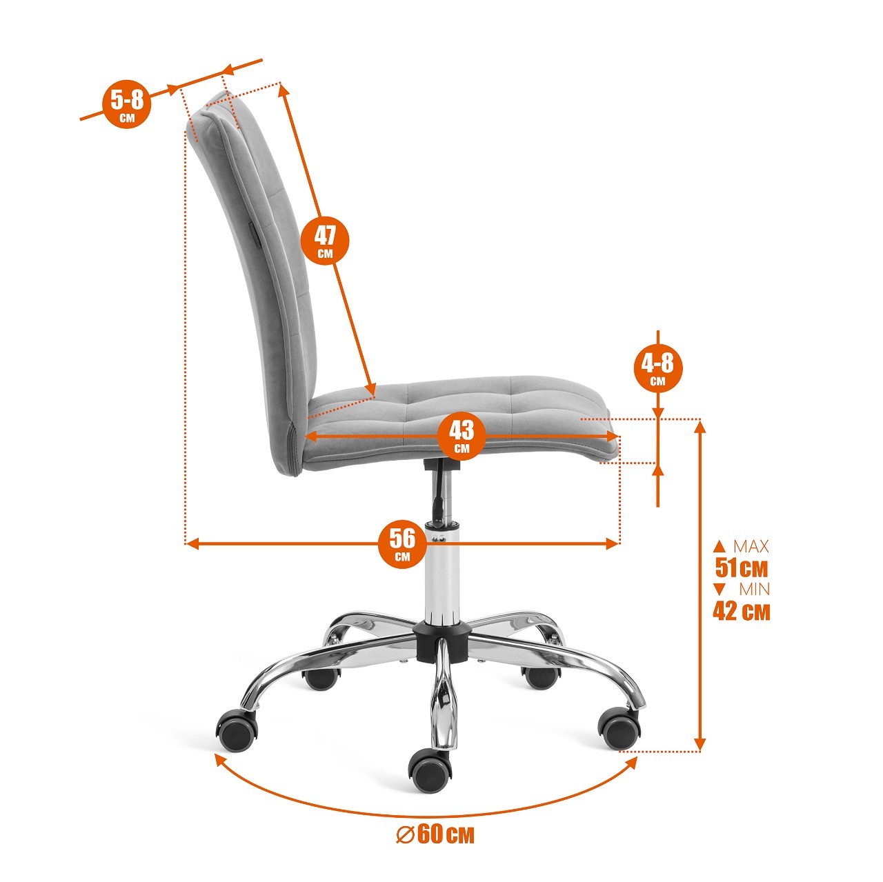 - Габаритная глубина кресла (от крайней задней точки спинки до передней точки сиденья) 56