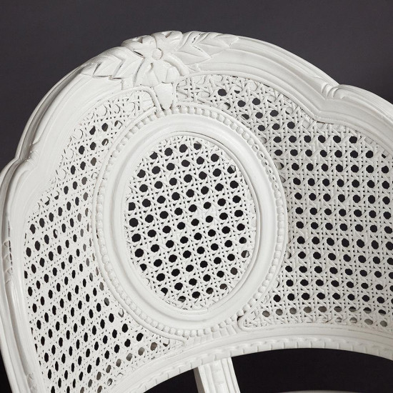 Изящное кресло Secret De Maison ROMA из французской коллекции VERSAILLES, выполненное в стиле прованс, изготовлено из массива красного дерева и натурального ротанга. Резные детали и узоры ручной работы, плетеные спинка и сиденье придают изделию особенную красоту, оригинальность и визуальную легкость. Небольшие потертости и царапины добавляют изысканность и особенный лоск. Каркас кресла изготовлен из массива красного дерева, покрытие белой краской и натуральным маслом подчеркивают природную красоту древесины. Обработанное по данной технологии дерево обладает повышенной прочностью, долговечностью и не требует специального ухода. Модель идеально сочетается с мебелью из коллекции VERSAILLES, поставляется в собранном виде.