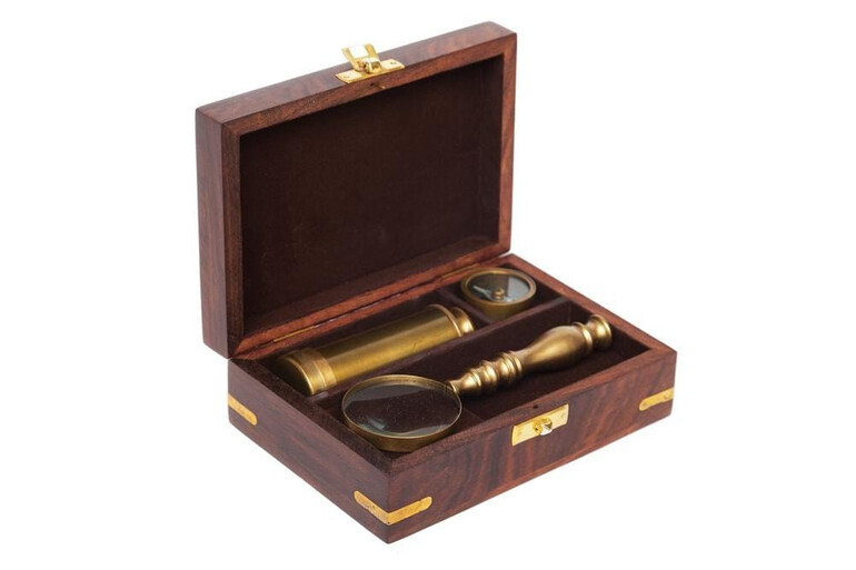 Уникальная коллекция подарков «Authentic Navigation» - это реплики исторических навигационных приборов, колониальных часов Викторианской эпохи, светильников, граммофонов и других предметов, которые украсят ваш интерьер и послужат отличным подарком для Ваших любимых. Труба раздвижная с увеличением х 2, Компас работающий. Лупа с увеличением. На коробочке латунный шильдик «якорь».