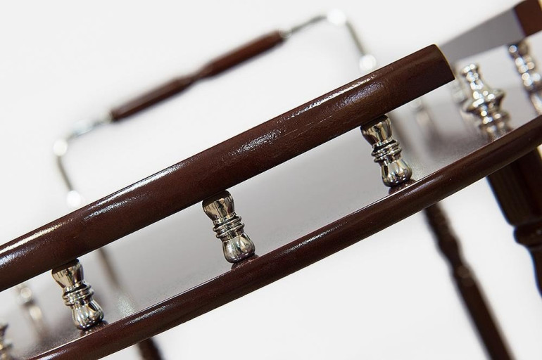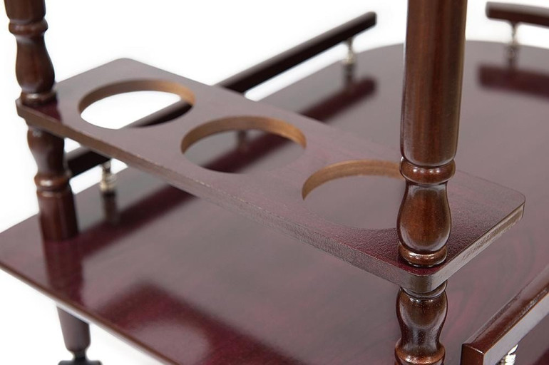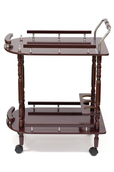 Сервировочный столик с двумя уровнями и специально оснащен для подачи винных бутылок. Столик оборудован колесики со стопором, что позволяет удобное перемещать его из кухни в гостиную вместе с угощениями.