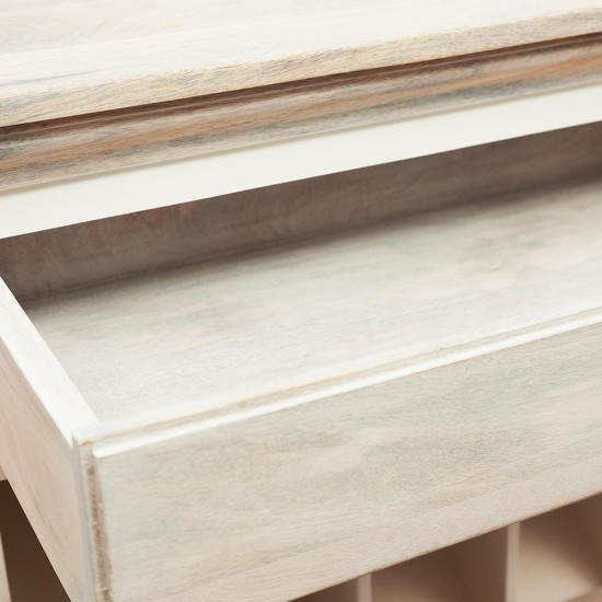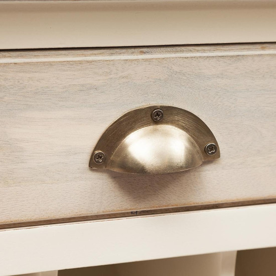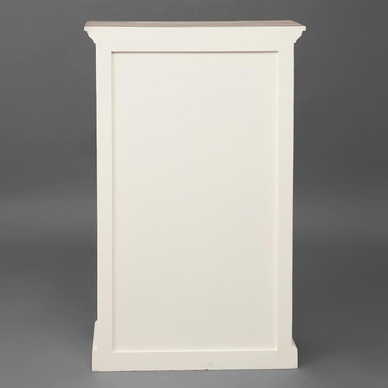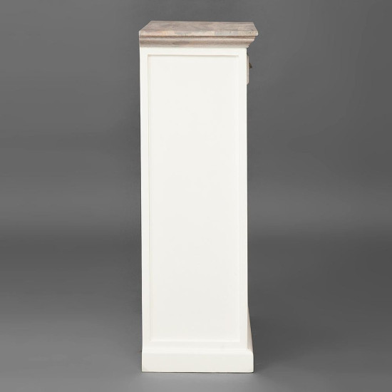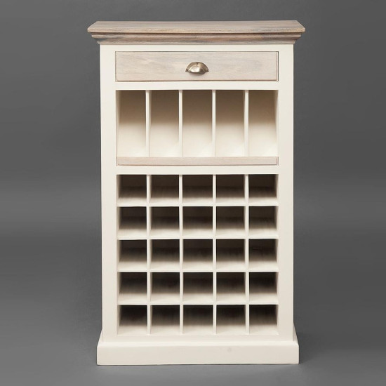 Уникальная Французская коллекция мебели «Riviera» выполнена из массива дерева манго. Формы и дизайн были разработаны конструкторским бюро во Франции. Эта коллекция отличается очень красивой комбинацией цвета: белый цвет и натуральное дерево с техникой white wash. Некоторые изделия выполнены с техникой sand blast (с эффектом старения древесины, когда дерево словно пролежало на песчаном пляже Средиземноморья много лет и песок и ветер обнажили всю красоту прожилок старого дерева). Шкаф винный с ящиком и отделениями для хранения винных бутылок, причем, верхний ряд сделан так, чтобы ваши редкие вина лежали под наклоном этикетками вверх. Объем: 0,5 м3. Материал: массив мангового дерева. Отделка: состаренная натуральная древесина с техникой white wash. Металлическая ручка с латунной отделкой прикручена старинными шурупами со прямым шлицем.