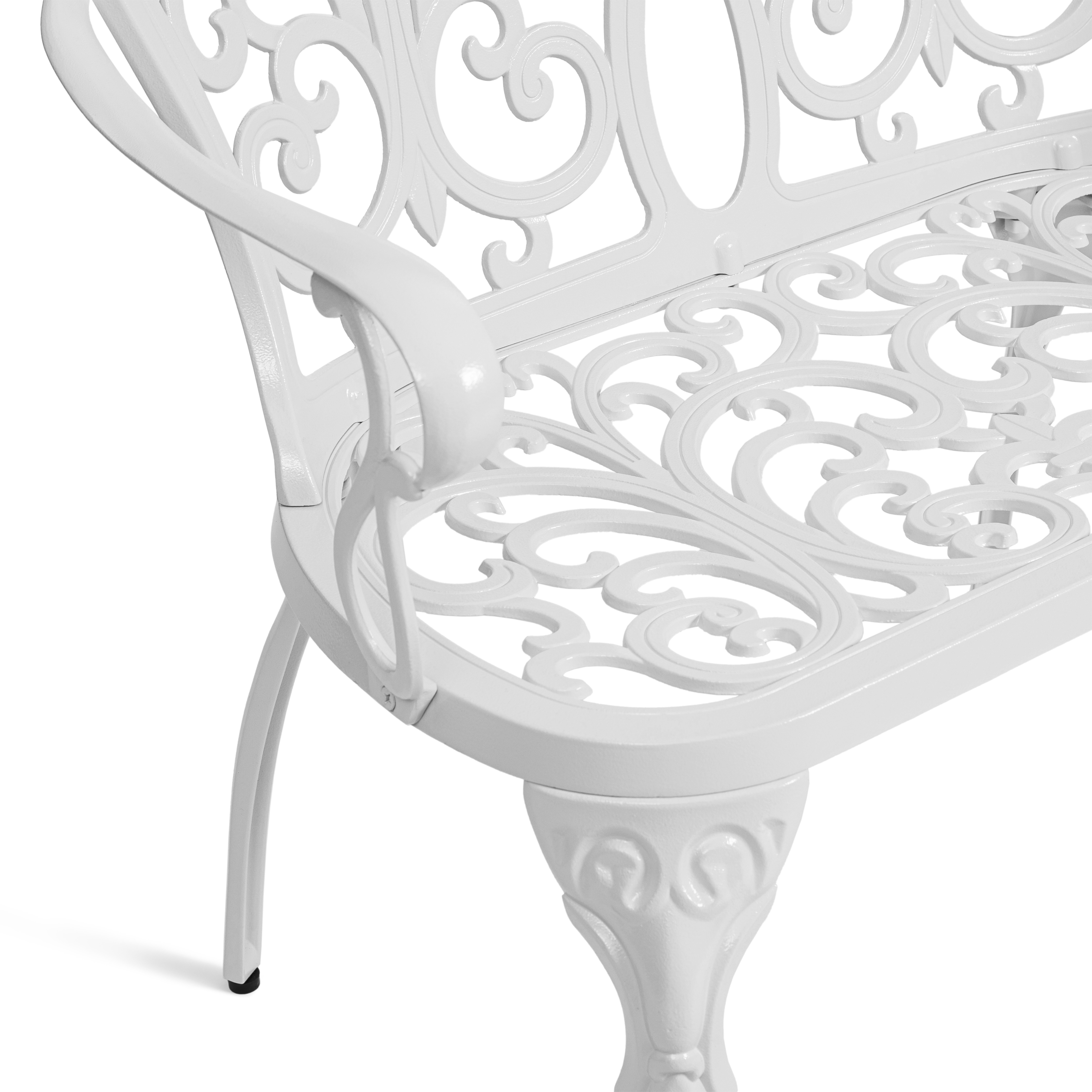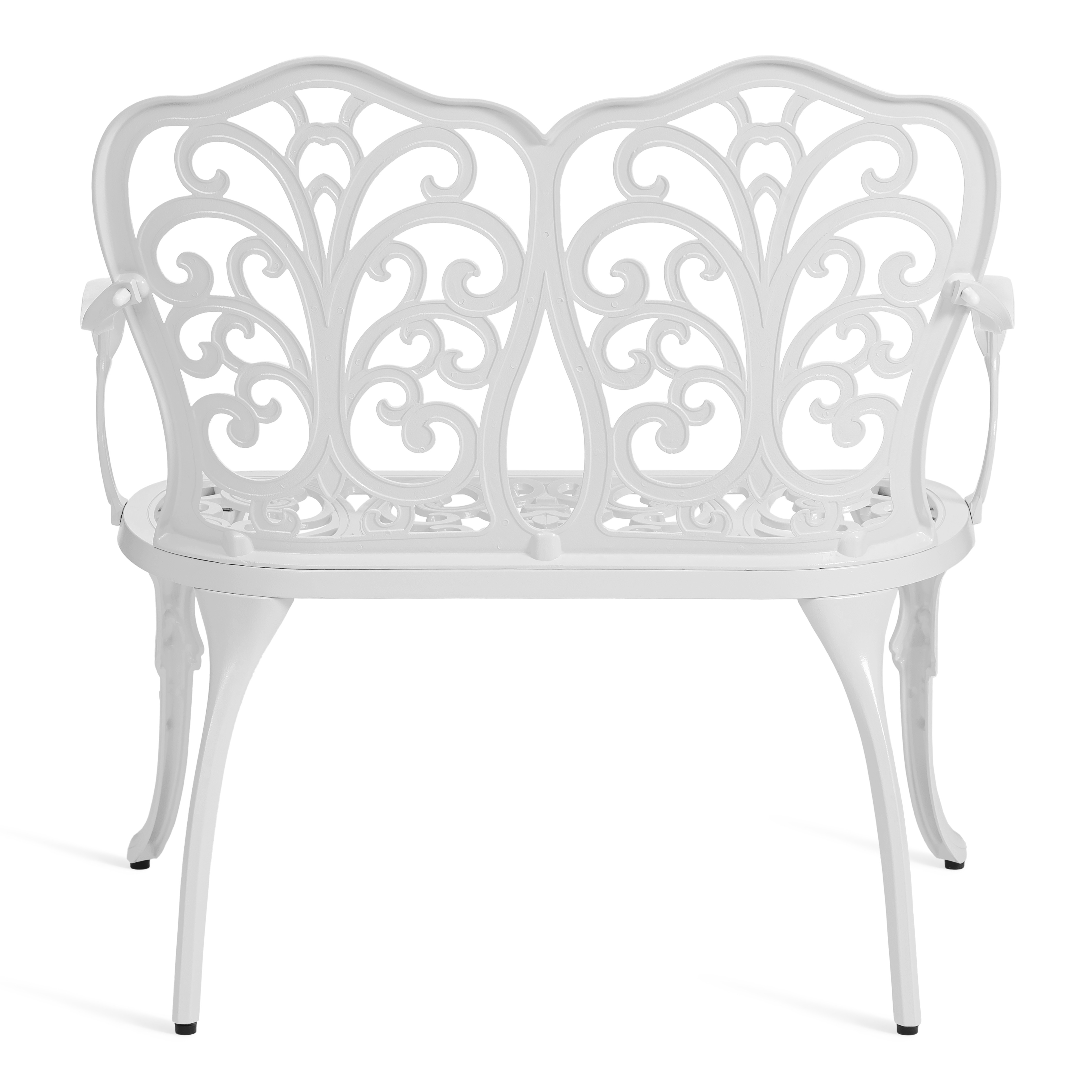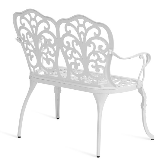 Преимущества скамьи Symphonie/Симфония: прочный каркас из литого алюминия, устойчивость к влаге и температурным перепадам, изящный дизайн в стиле прованс, удобная спинка и подлокотники, долговечность и простота ухода.