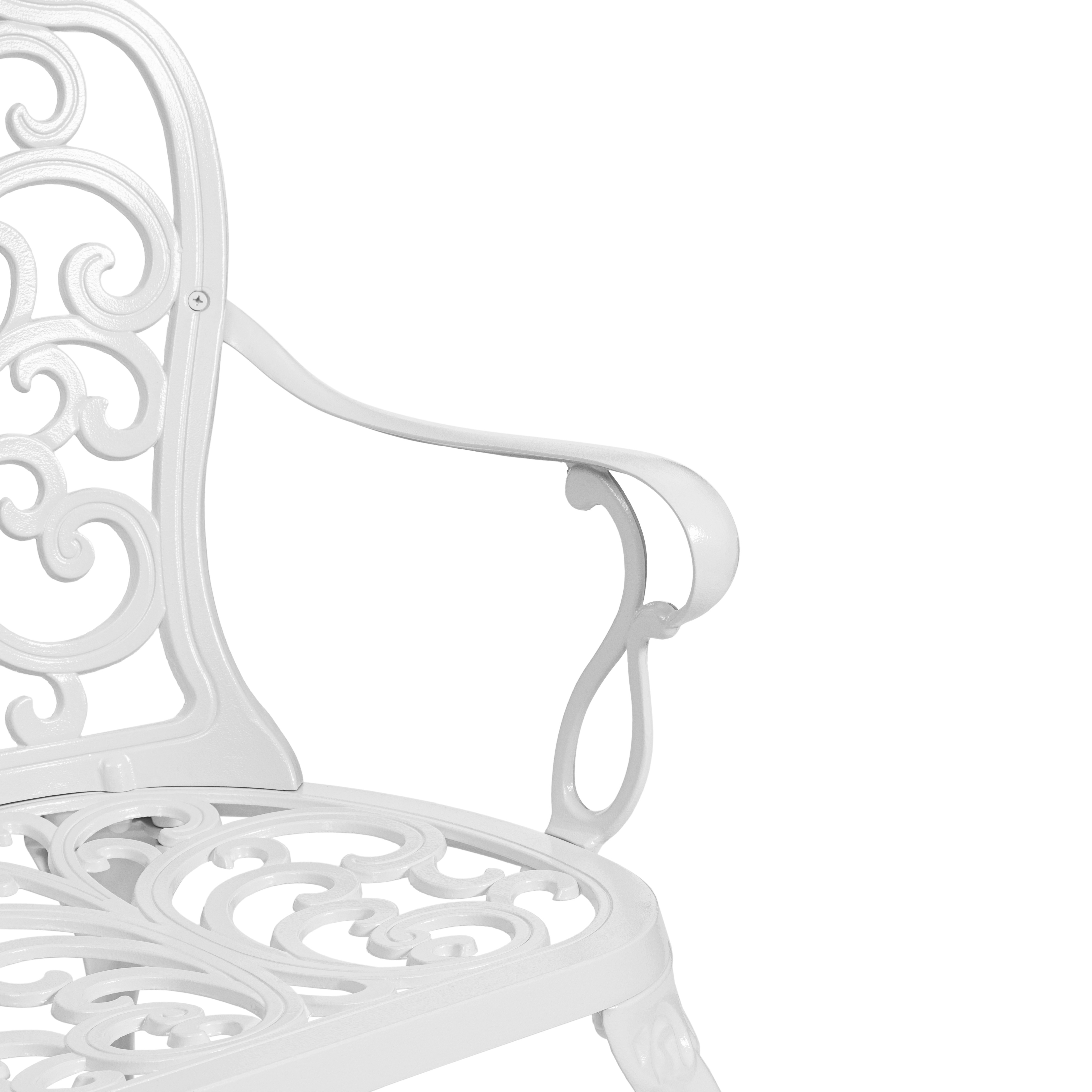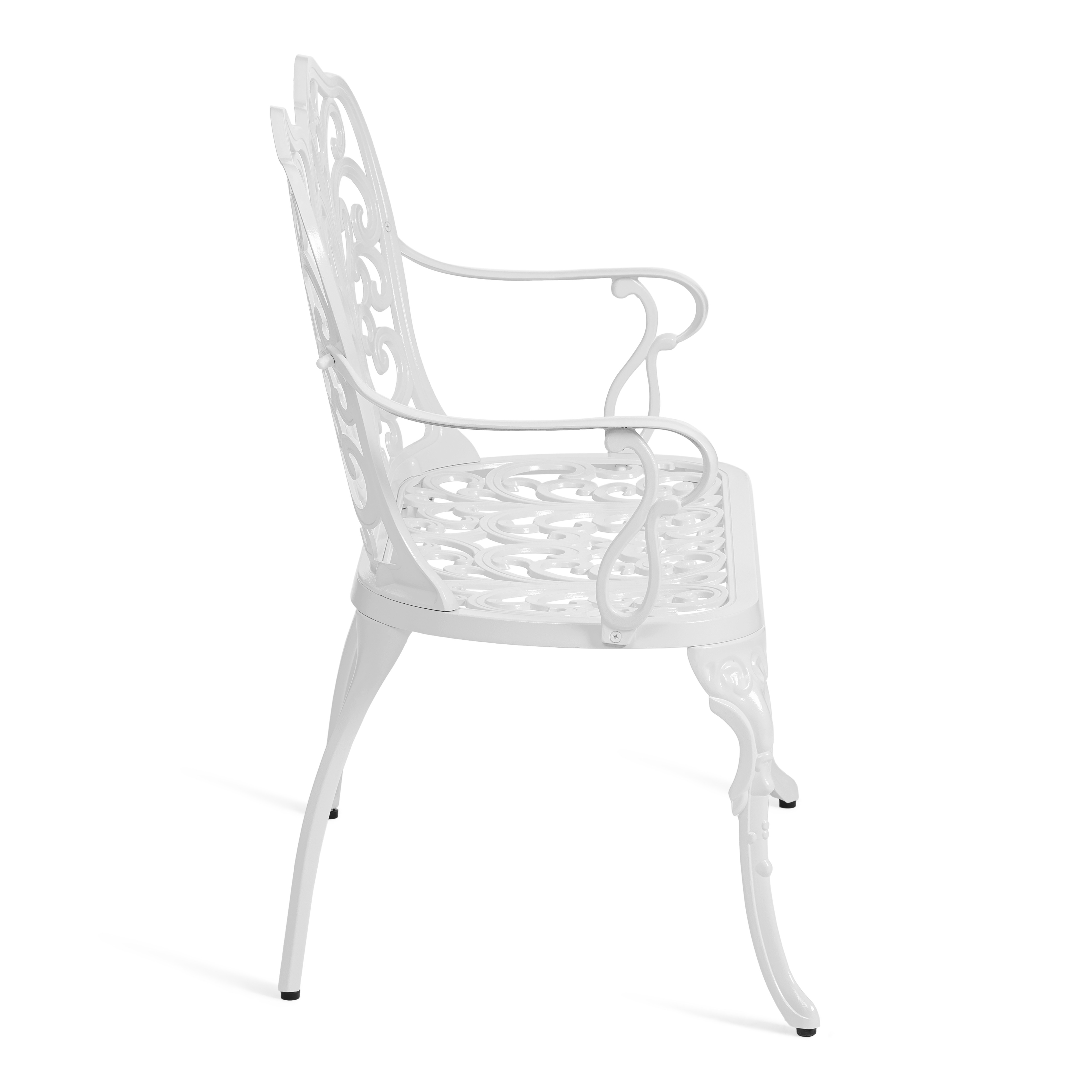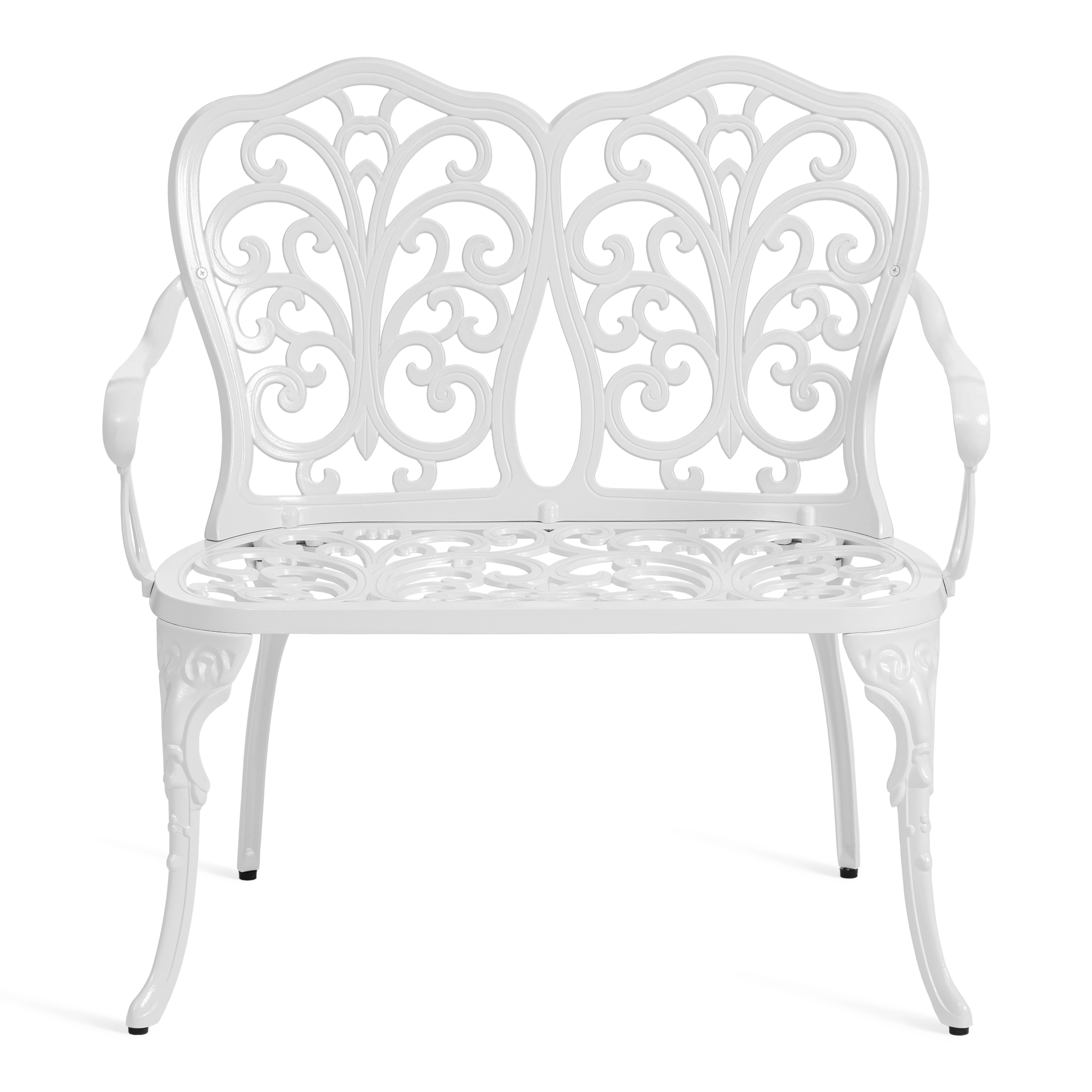 Преимущества скамьи Symphonie/Симфония: прочный каркас из литого алюминия, устойчивость к влаге и температурным перепадам, изящный дизайн в стиле прованс, удобная спинка и подлокотники, долговечность и простота ухода.
