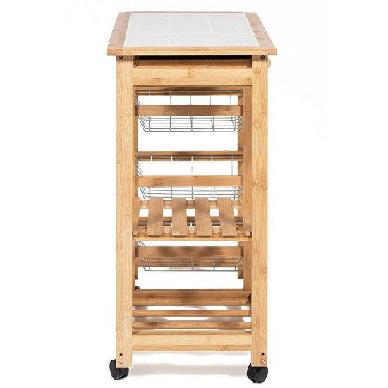 Коллекция «Экостиль» представляет легкие, прочные, изделия из натурального прессованного бамбука, с красивой фактурой, полностью экологичные, не подверженные влаге, для кухни, ванной и жилых комнат. Столик передвижной кухонный разделочный на колесиках, столешница из плитки, с 2-мя ящиками и тремя металлическими выдвижными полками. Материал: прессованный бамбук, поставляется 1 шт. в 1 кор.; объем 0,05м3.
