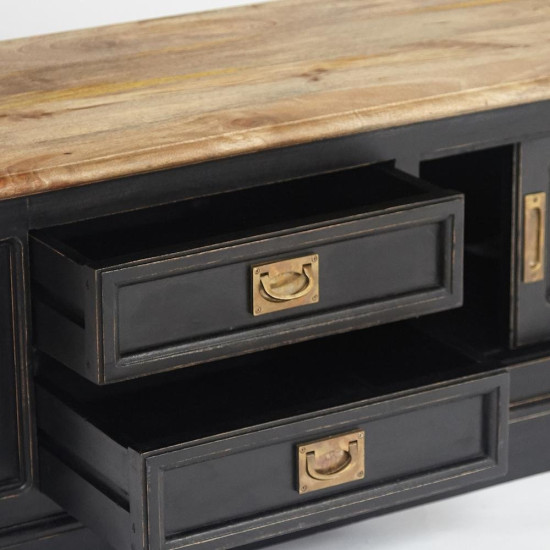 Изысканный дизайн, простые линии и естественные цвета ТВ тумбы Secret De Maison из французской коллекции BLACK LABEL выгодно выделяют ее в интерьере. Винтажная фурнитура и светлая столешница из дерева манго в сочетании с прочным каркасом из массива акации, покрашенным в черный цвет, подчеркивают красоту и благородство изделия. Два удобных выдвижных ящика и просторное отделение с полкой за раздвижными дверцами – тумба по-современному проста и функциональна. Натуральная древесина манго и акации, обработанная прозрачным маслом, долговечна и не требует специального ухода. Модель отлично гармонирует с мебелью из коллекции BLACK LABEL. Поставляется в собранном виде.